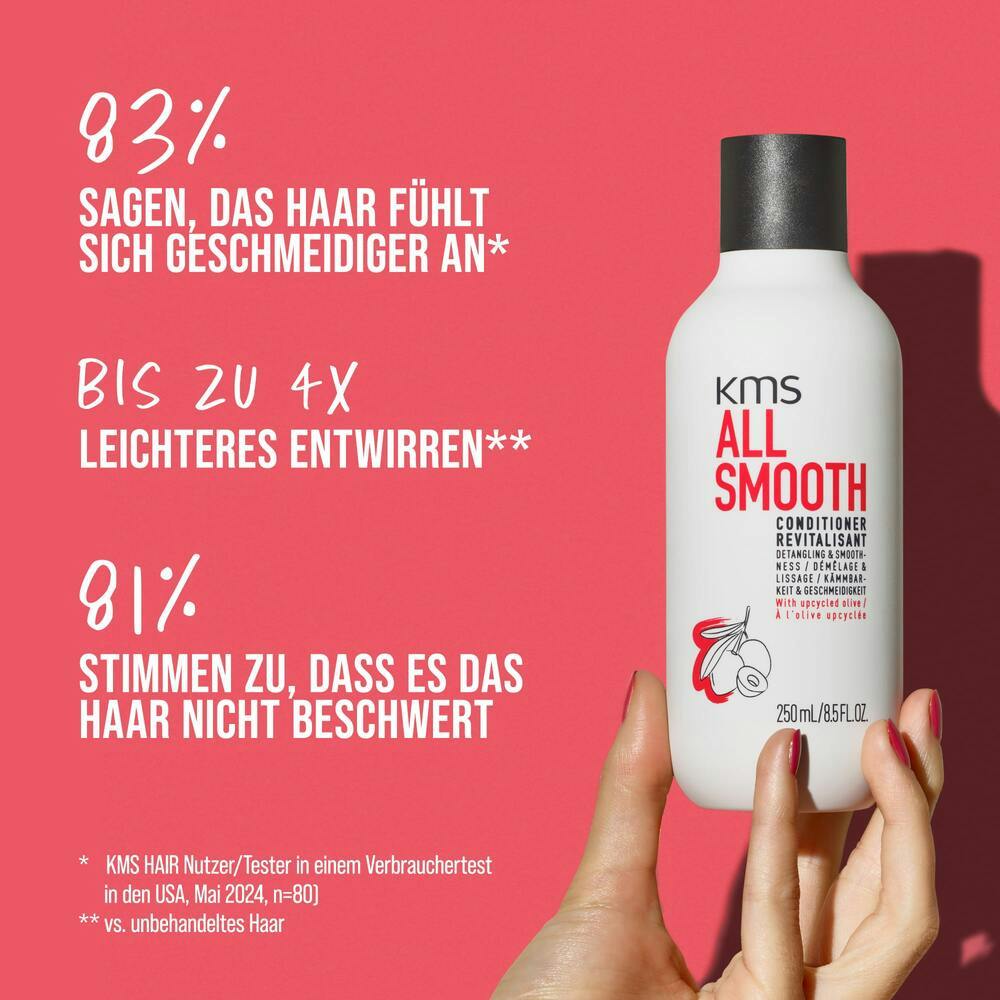 Ob langes, dickes oder strukturiertes Haar – der KMS ALLSMOOTH Conditioner sorgt für müheloses Entwirren und spürbar geschmeidige Längen. Er macht das Haar bis zu viermal leichter kämmbar und fördert die natürliche Elastizität. So bleibt es gesund, weich und voller Bewegung – Tag für Tag.